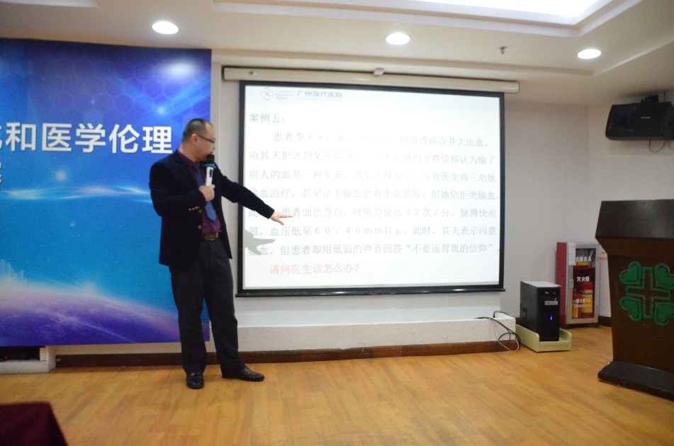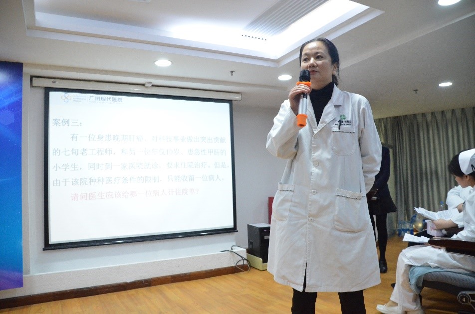 据悉,参加本次竞赛的5支队伍由医生、护士、药师等各个科室的医护人员组成。在赛场上,他们将各自队伍的论点、论据生动有趣地展现出来。比赛精彩纷呈,各个队伍的选手们各出奇招,气氛热烈非凡。比如第五组带来的案例:一位有宗教信仰且又因胃溃疡失血过多有生命危险的中年妇女休克不接受输血,现场进行了热烈讨论:比如患者因宗教信仰拒绝输血,要不要给患者输血?违背她意愿输血,救活后患者会不会因为信仰而痛苦不堪甚至轻生?给她输血了违背了医学伦理中的自主原则?……等等